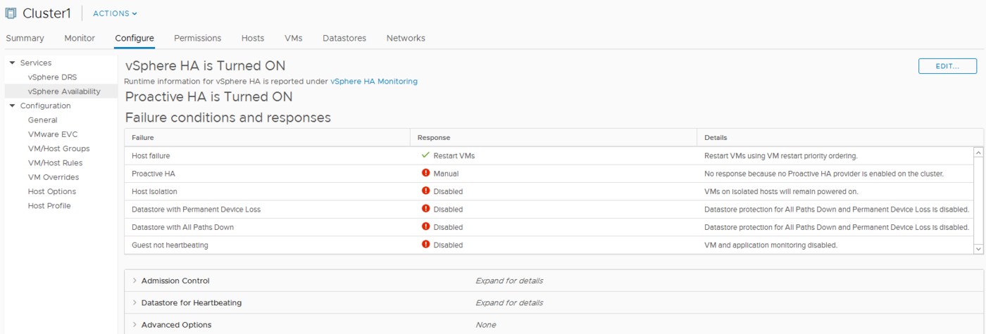 It is also important to enable host monitoring. This setting allows pulsing signals to be sent between ESXi hosts to detect a possible failure. Disabling it is required to perform update operations with Update Manager.