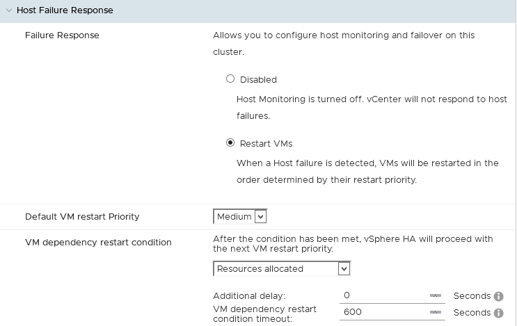You can also select a condition other than the default (Allocated Resources), which vSphere HA will verify before restarting.