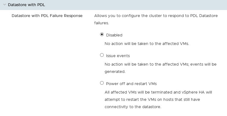 If a datastore fails with a permanent device loss (PDL) state, you can set the actions to take: