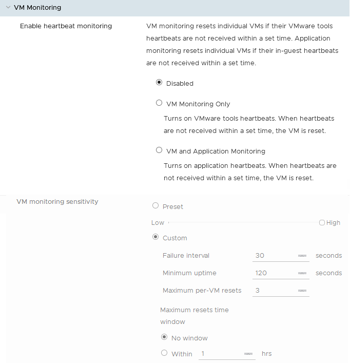 VM monitoring is available after VMware tools is installed, in case of non-response via the tools (heartbeat signals) the virtual machine will be automatically restarted. Advanced configuration is possible for this feature (for example, reboot interval).